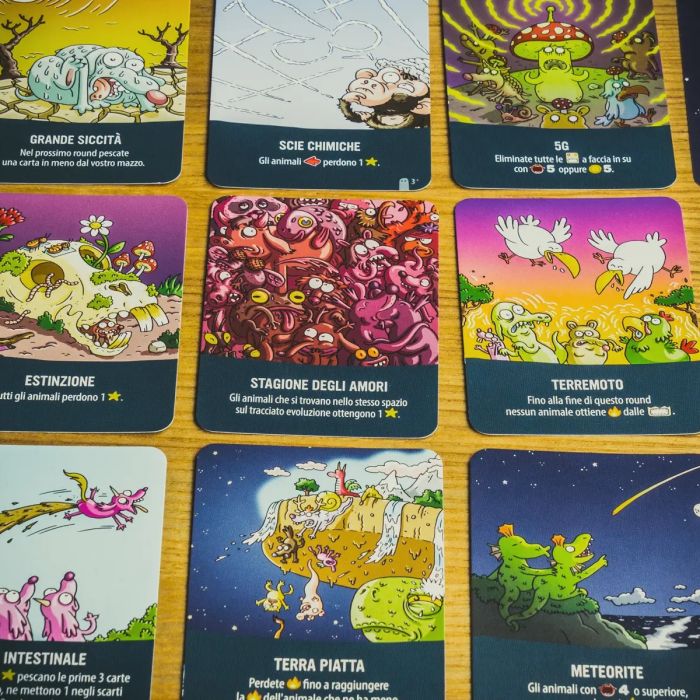 In Barbascura X - Evolversi Male, scegli tra sei animali unici: Tardigrado, Orca, Cetriolo di Mare, Camaleonte, Panda e Mantide, ognuno dotato di un potere speciale che può cambiare le sorti del gioco. Con oltre 100 carte originali, ogni partita è un'esperienza nuova e stimolante, arricchita dalle illustrazioni uniche di Enrico Macchiavello. Il gioco include un massiccio Totem di legno, un tabellone colorato e dinamico, 36 gettoni Evoluzione e 6 segnalini Pressione Evolutiva. Ogni elemento è pensato per offrire un'esperienza di gioco coinvolgente e strategica.