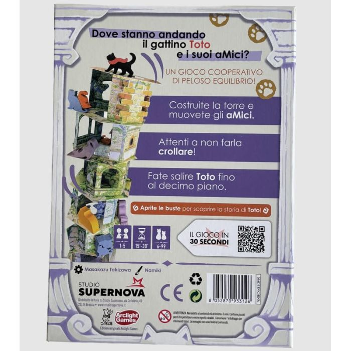 Il Gatto e la Torre è un gioco cooperativo che unisce tattica e destrezza in un'esperienza di gioco unica. I giocatori lavorano insieme per costruire una torre e posizionare gli amici del gattino Toto in posizioni strategiche, permettendo a Toto di raggiungere la cima. Durante questa avventura, i partecipanti scoprono dettagli intriganti sulla storia di Toto, arricchendo il gioco con un crescendo narrativo che stimola emozioni e riflessioni.